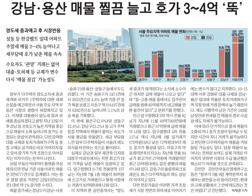 고가주택 (강남 3구와 용산, 성동구)에서 매물 증가세를 보임..