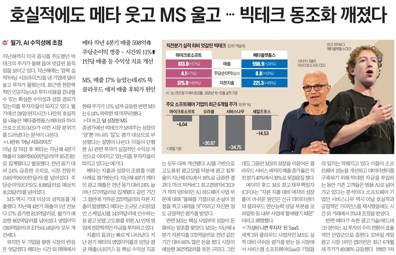 AI관련 투자가 실질적인 수익성 개선으로 이어졌는가를 투자자가 따지며 주가가 다른 양상을 보임.